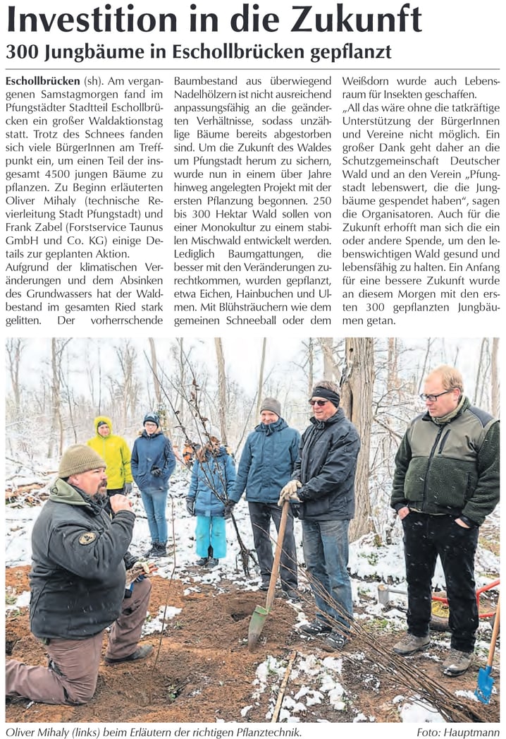350 Bäume für den Eschollbrücker Wald: Der Verein „Pfungstadt lebenswert“ kümmert sich mit Spendern und Stadt-Forstwirt Oliver Mihaly um neue Anpflanzungen.